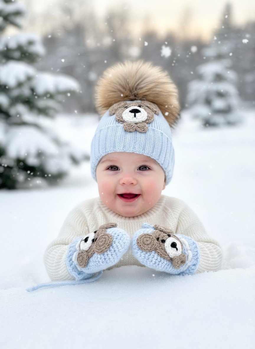 Nádherný luxusný čiapkový set značky NIKOLAROYAL Čiapka aj rukavičky sú príjemná pletenina s 3D medvedíkom.Čiapka s bohatým brmbolcom je na viazanie a je podšitá bavlnou.Perfektná kombinácia pre luxusný ŇUŇU TEDY imidž.3D krásna aplikácia...